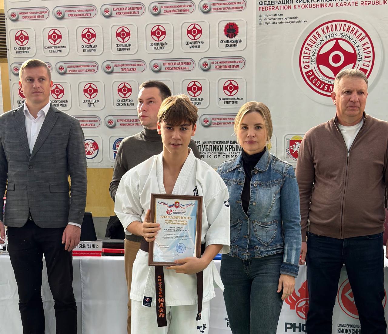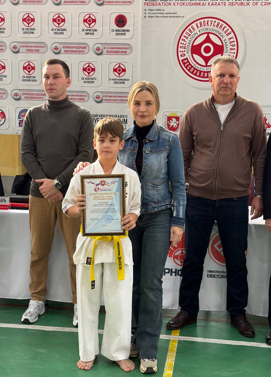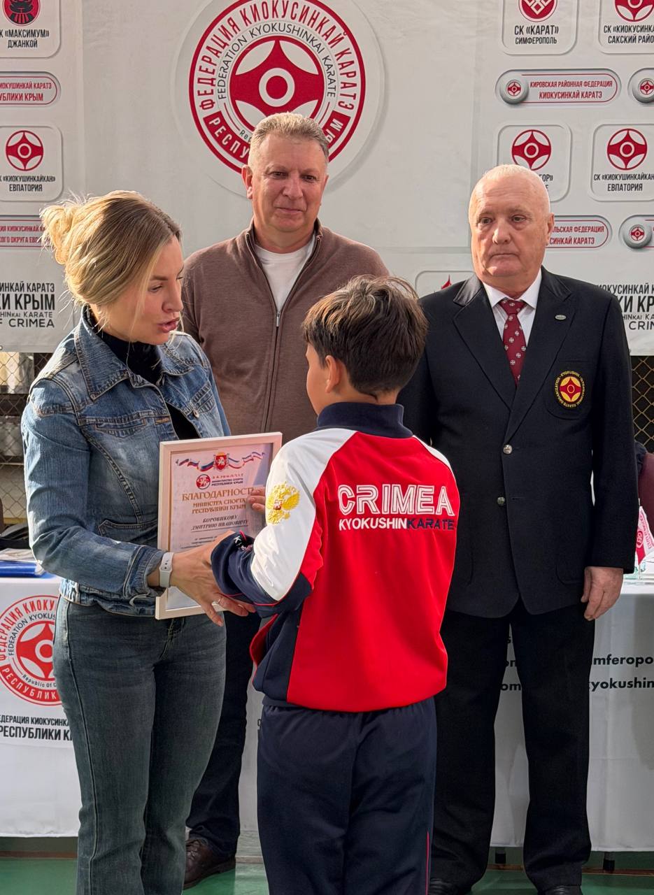 Вручила благодарности Министерства спорта Республики Крым спортсменам и тренерам сборной команды Республики Крым по Киокусинкай за успешные выступления на Международных соревнованиях среди мальчиков и девочек, юношей и девушек, юниоров и юниорок, мужчин и женщин «Belarus Open Cup - 2025», которые прошли в городе Минск (Беларусь).